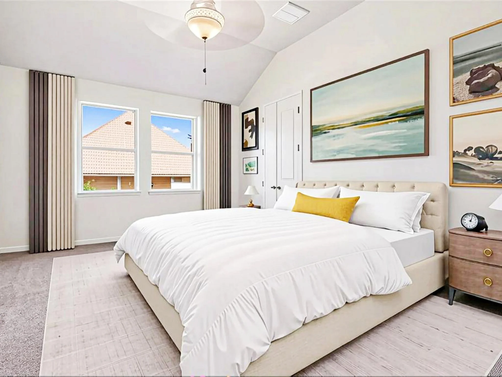 The primary bedroom presents a tranquil environment, featuring two handsome windows that illuminate the space with natural light and provide a pleasant view of the patio and yard. Enhanced virtually to showcase its ample dimensions, this room is versatile, accommodating a variety of furniture arrangements with numerous design possibilities. The primary bath is conveniently located ensuite, as detailed in the accompanying floor plan below.